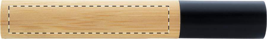 Eleganter, schwarzer Drehkugelschreiber aus Metall mit Bambusschaft und schwarzen Elementen. Einzeln im Etui aus Bambus mit schwarzer Abdeckung. Blauschreibend.